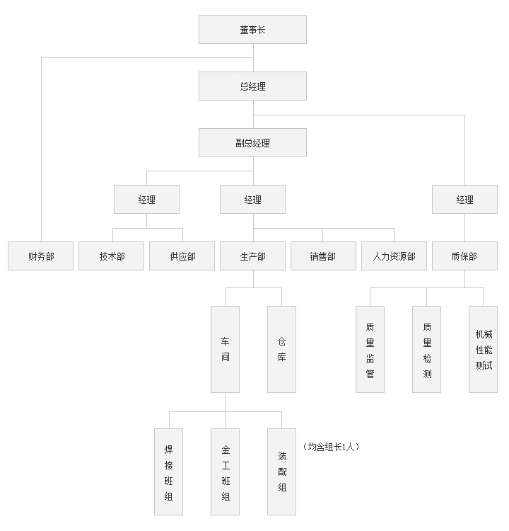 3)經(jīng)理:分管有技術(shù)部,供應(yīng)部,質(zhì)保部等部門,各司其職。主要負(fù)責(zé)資源的配置、產(chǎn)品的制造、技術(shù)的保障、生產(chǎn)的過程、產(chǎn)品的質(zhì)量、銷售和售后服務(wù)等全方位控制。